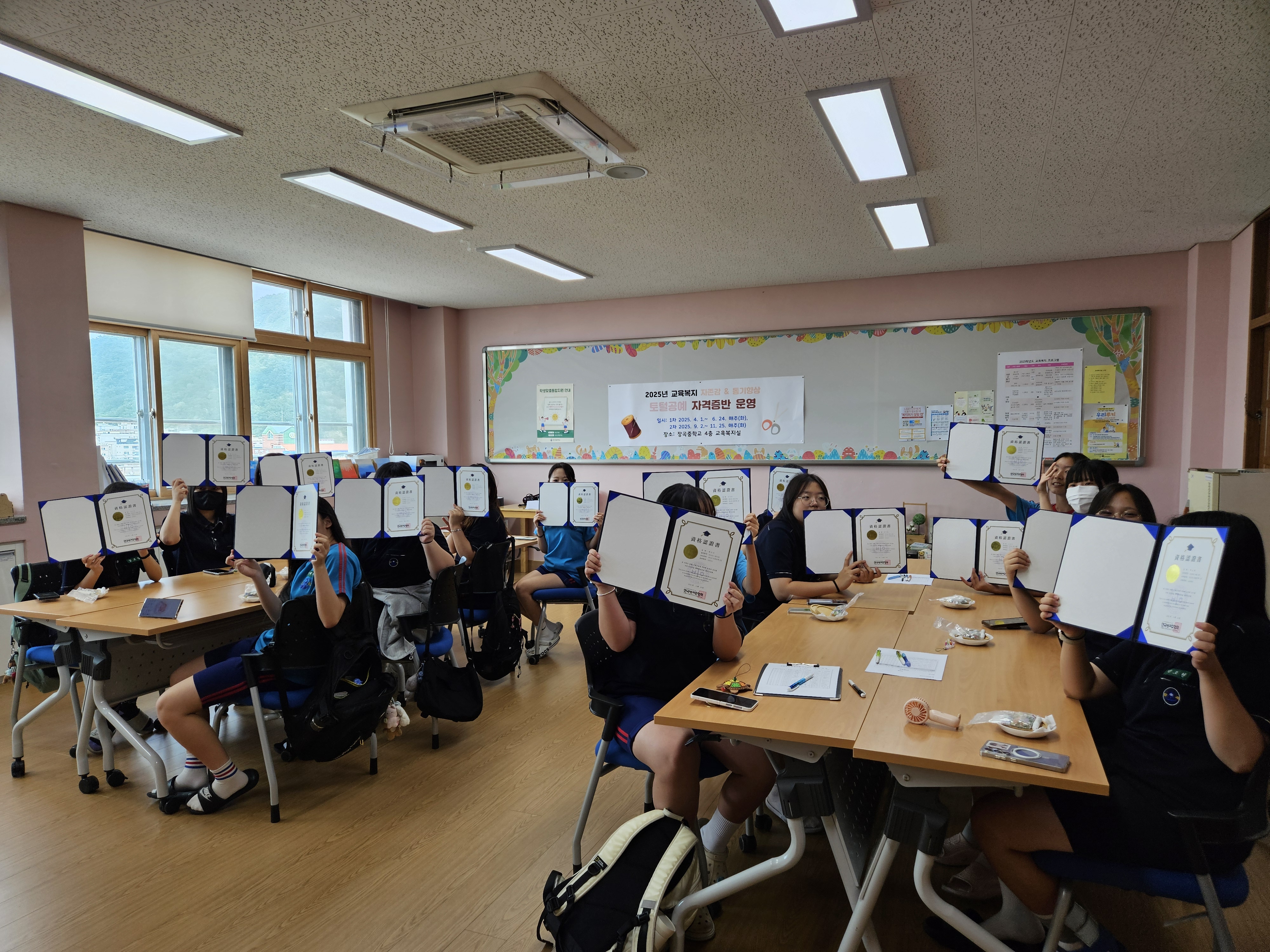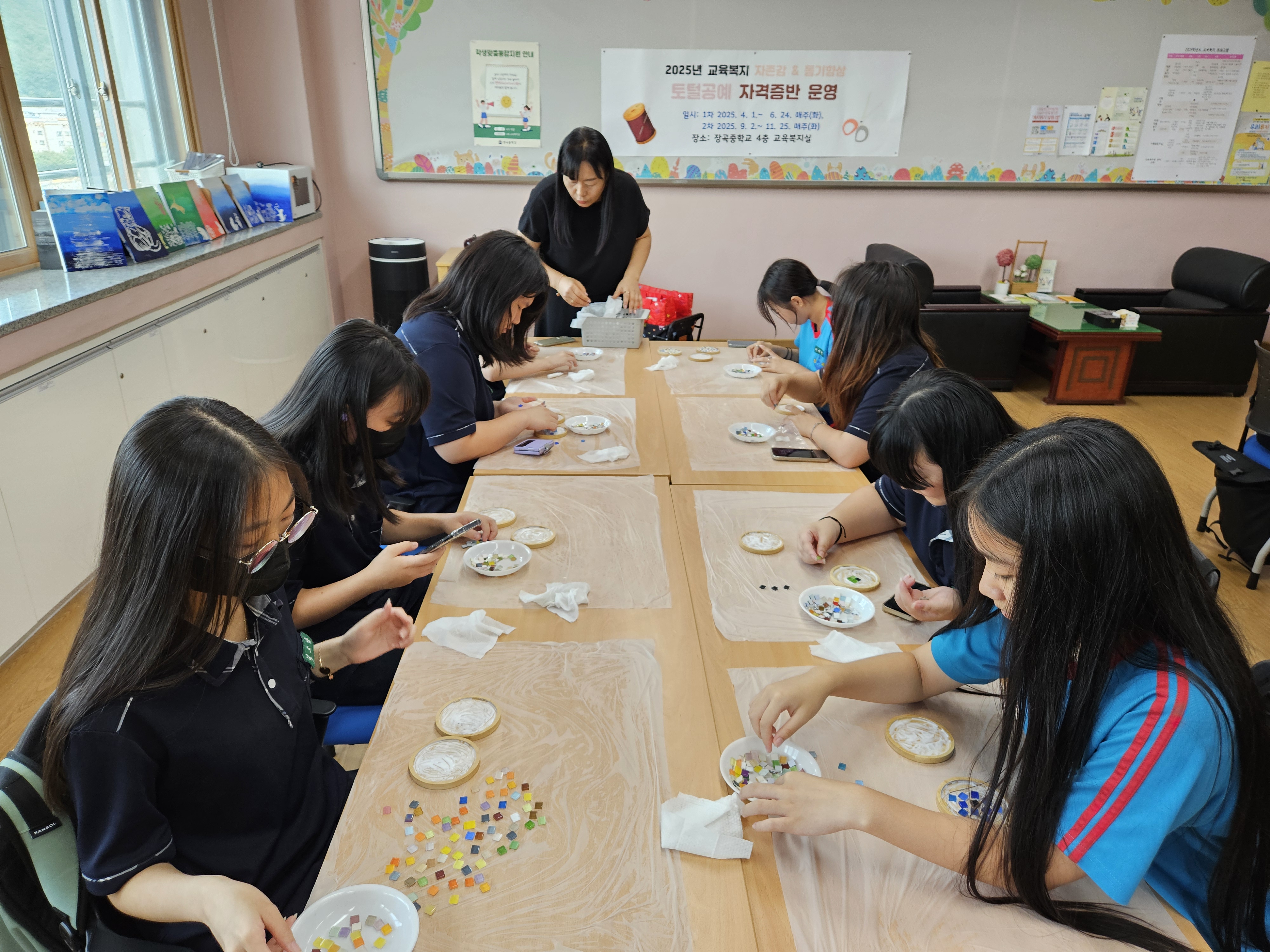 □ 청소년 토털공예 자격증반 운영은 장곡중학교 교육복지 특색프로그램으로 자존감과 학습 동기가 낮은 학생들을 대상으로 학기당 각 10회씩 운영하며, 진로 및 고교입학과 연계하여 자격증 취득을 목적으로 운영하였다.