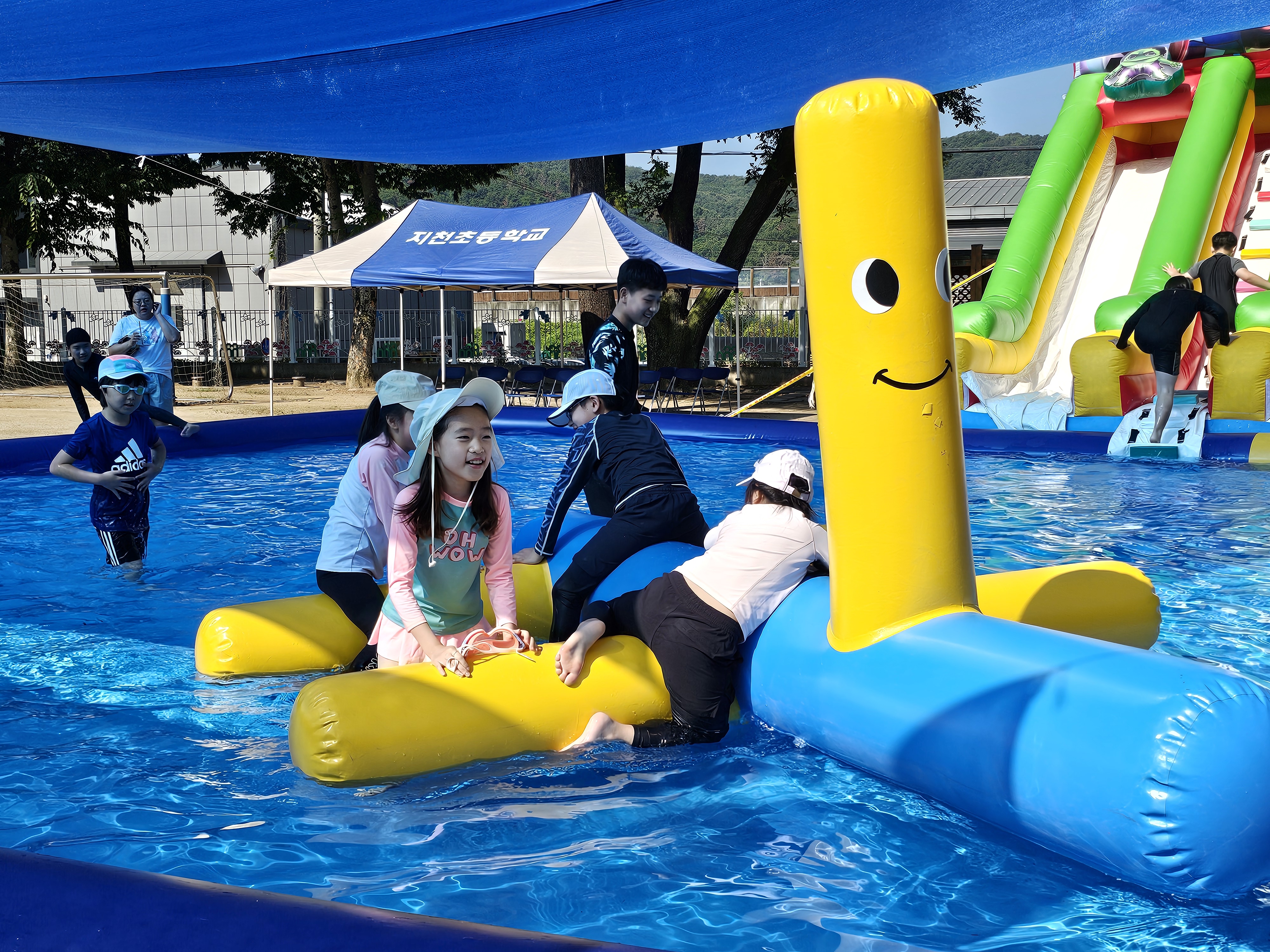 □ 지천초등학교는 1학기 동안 열심히 학교생활을 한 학생들에게 여름방학 전 특별한 추억을 선물하고 무더위를 시원하게 날려버리기 위해 '찾아오는 물놀이 체험행사'를 마련하였다. 이번 행사에는 대형 워터 풀장, 워터슬라이드, 에어바운스 등 다양한 물놀이 시설을 학교 운동장에 설치하여 학생들에게 잊지 못할 즐거운 시간을 제공하였다.
