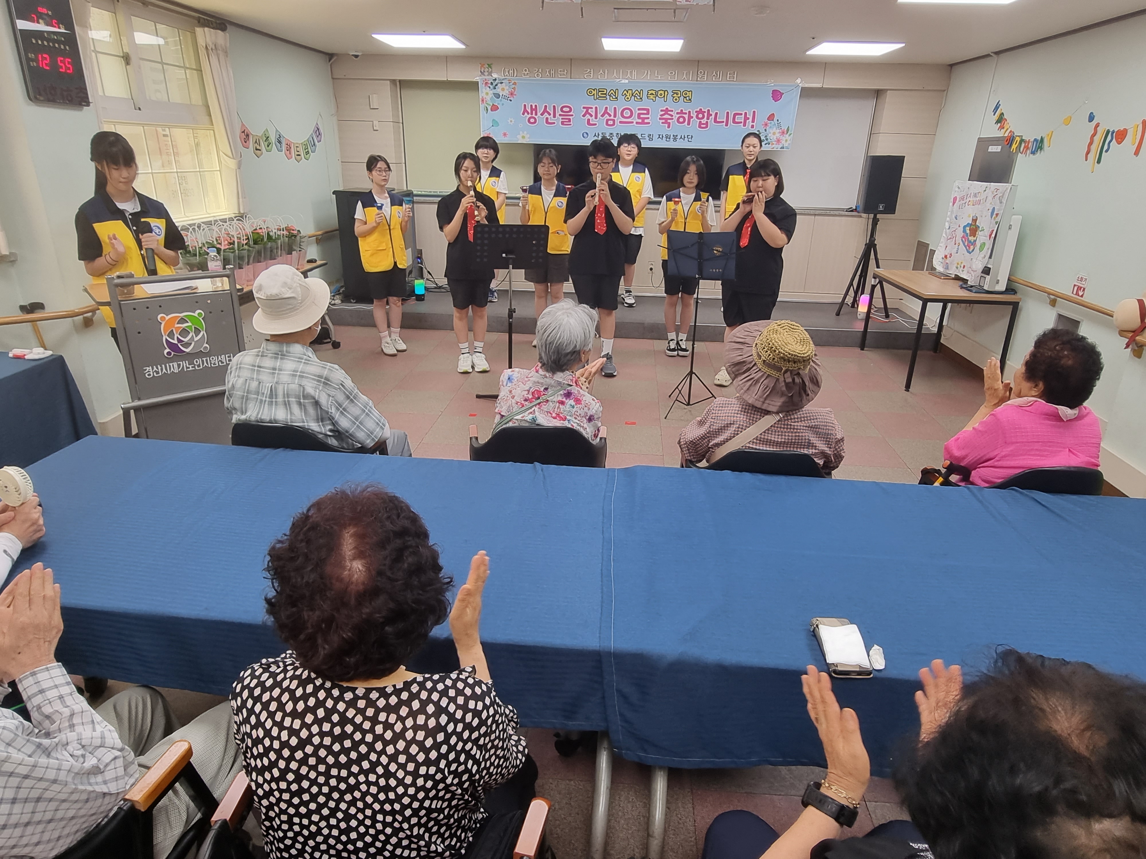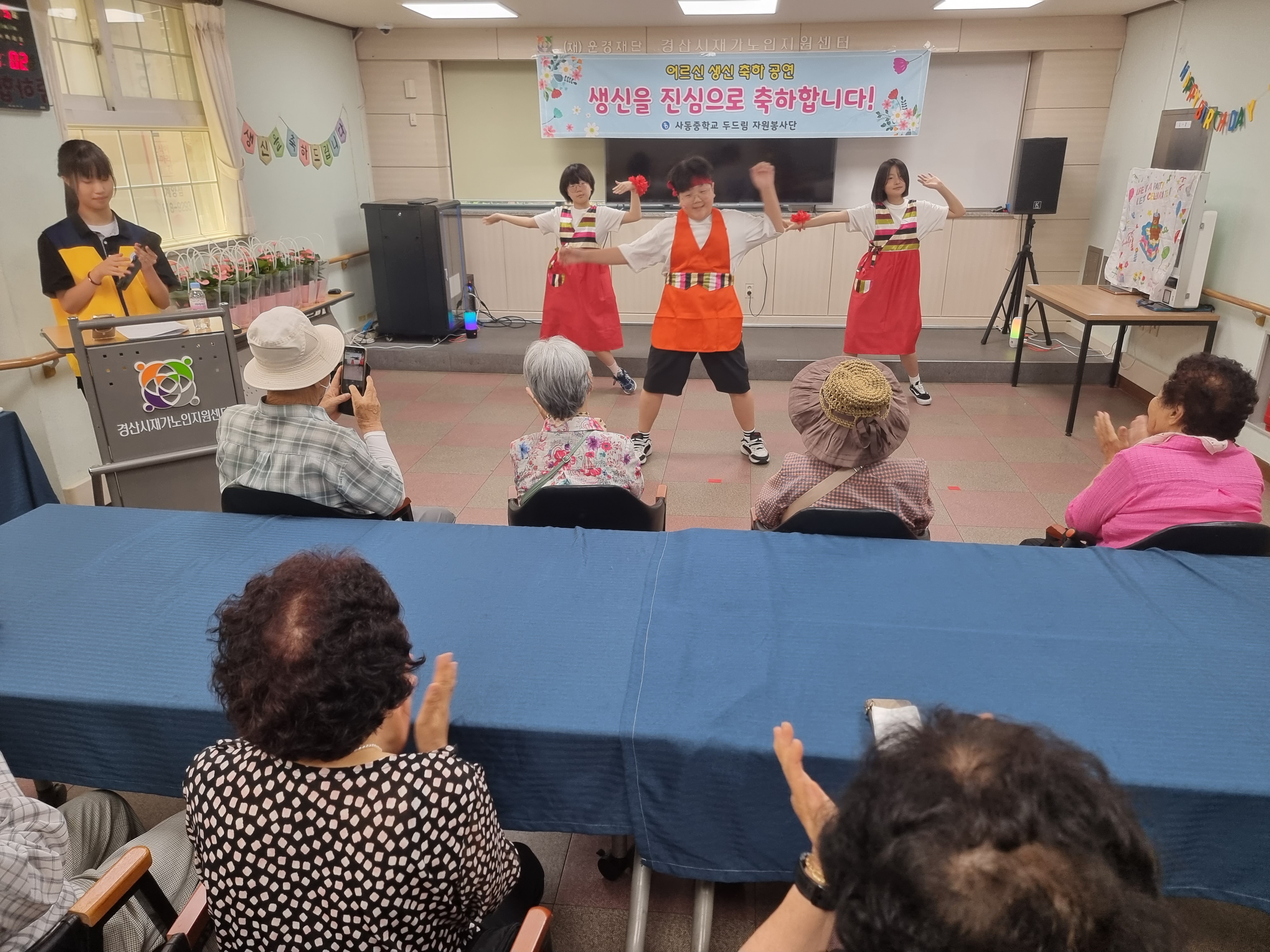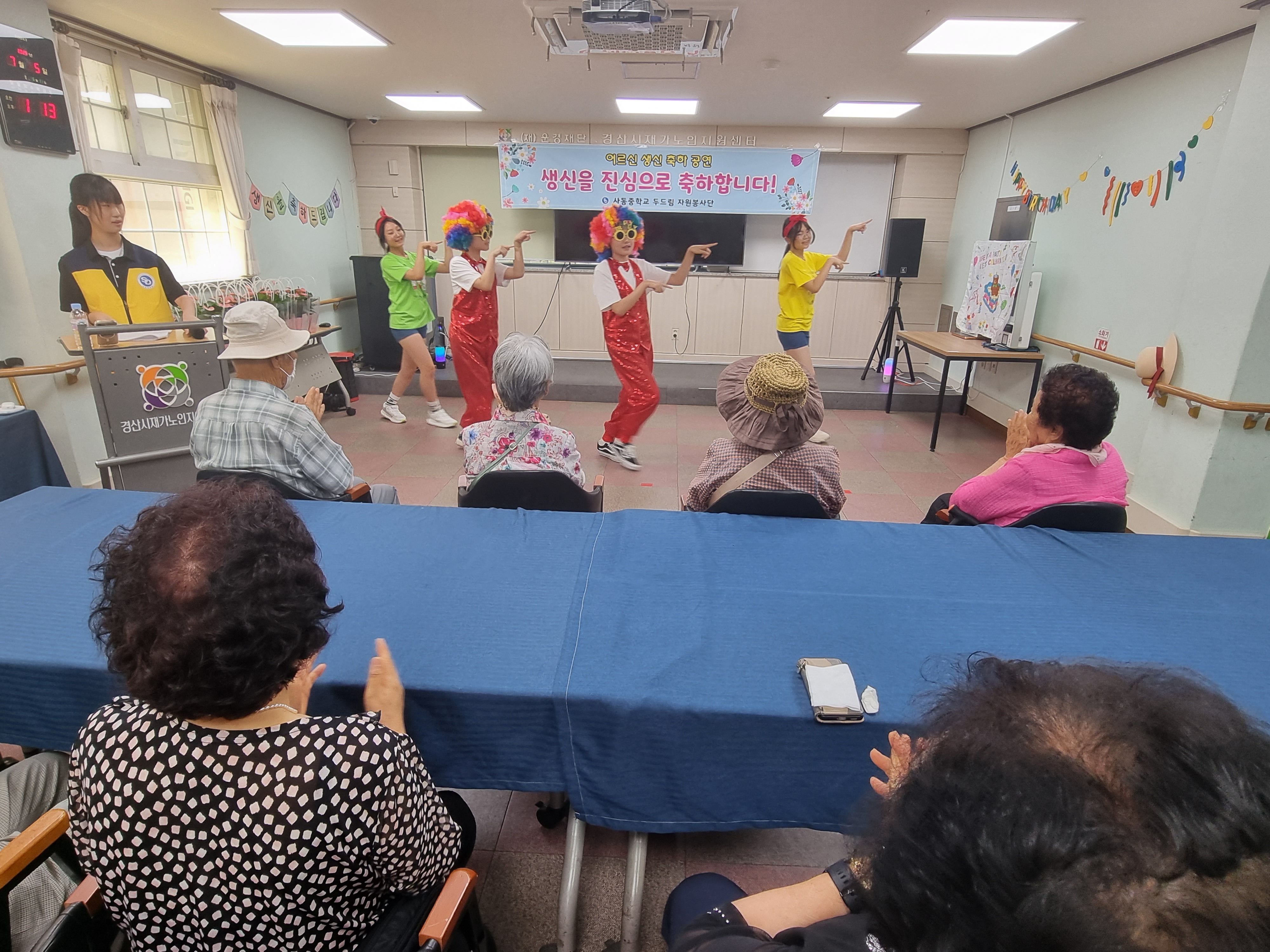 □ 사동중학교(교장 이승연) 행복두드림자원봉사단은 7월 5일 경산시재가노인통합지원센터를 방문하여 생신을 맞이하신 지역 어르신들을 위해 다채로운 축하 공연을 열었다.