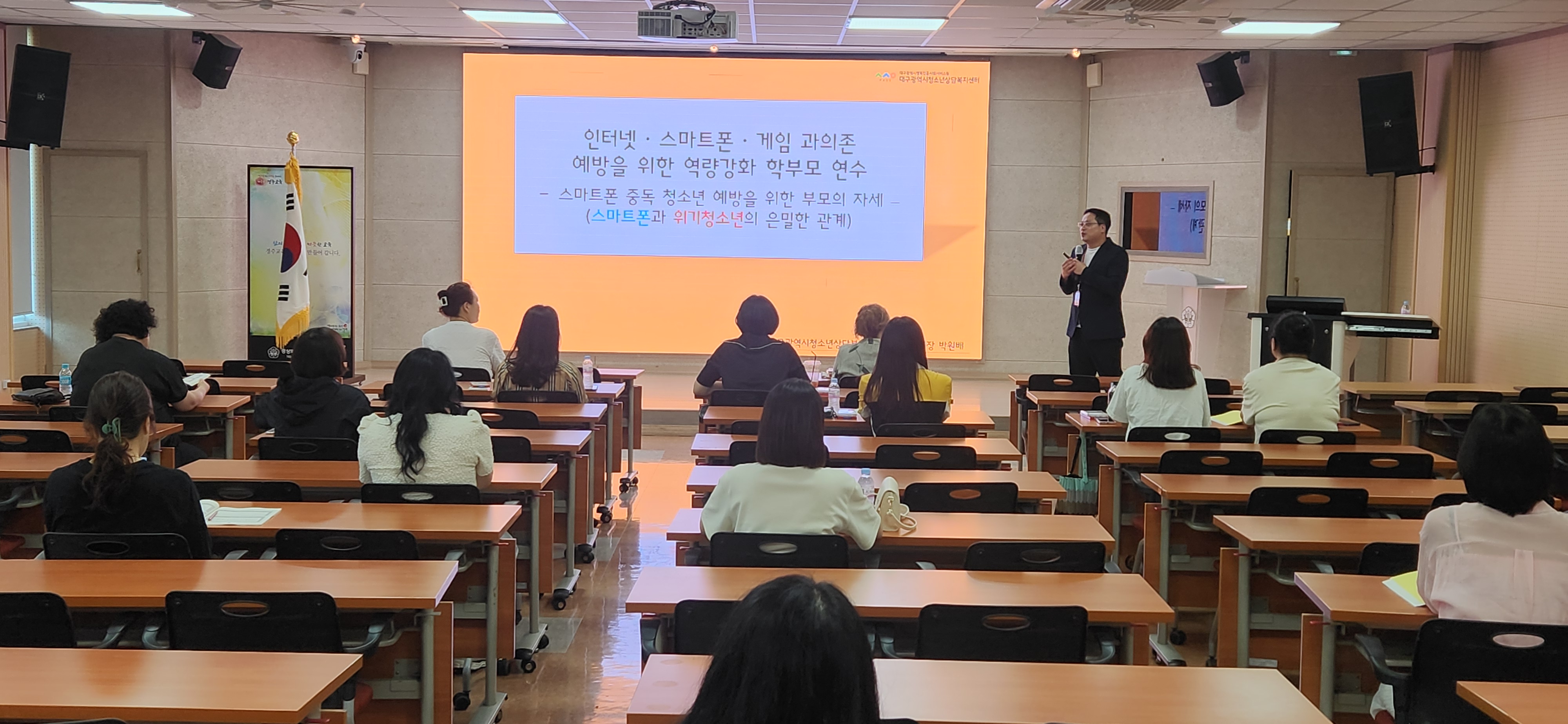 이날 연수에서는 대구광역시청소년상담센터 박원배 팀장이 청소년 미디어 과의존의 실태와 원인, 예방 및 대처 방안을 중심으로 부모교육 강의를 진행하였다. 이어 교원을 대상으로 청소년 미디어 이용습관 진단조사 운영과 사후 관리 방법, 사이버도박 중독 예방 프로그램 등을 소개하며 현장의 실천 방안을 공유하였다.