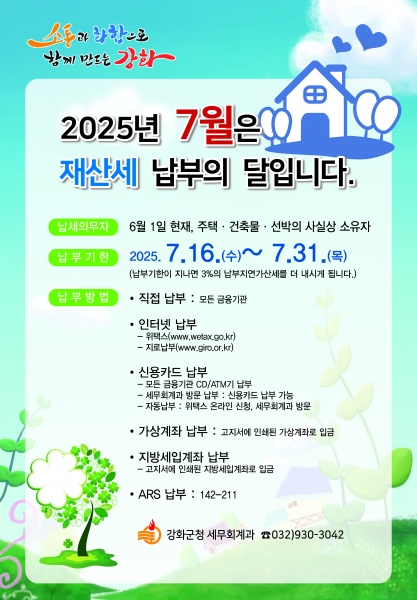[금요저널] 강화군은 2025년 7월 정기분 재산세 48,624건, 총 55억 4천6백만원을 부과·고지하고 오는 7월 31일까지 납부해 줄 것을 당부했다.