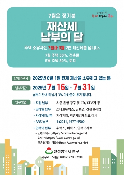 7월분 재산세 부과 대상은 매년 6월 1일 현재 동구에 소재한 주택, 건축물을 소유한 자에게 부과하는 것으로 주택은 연세액을 7월과 9월에 50%씩 나누어 고지된다.