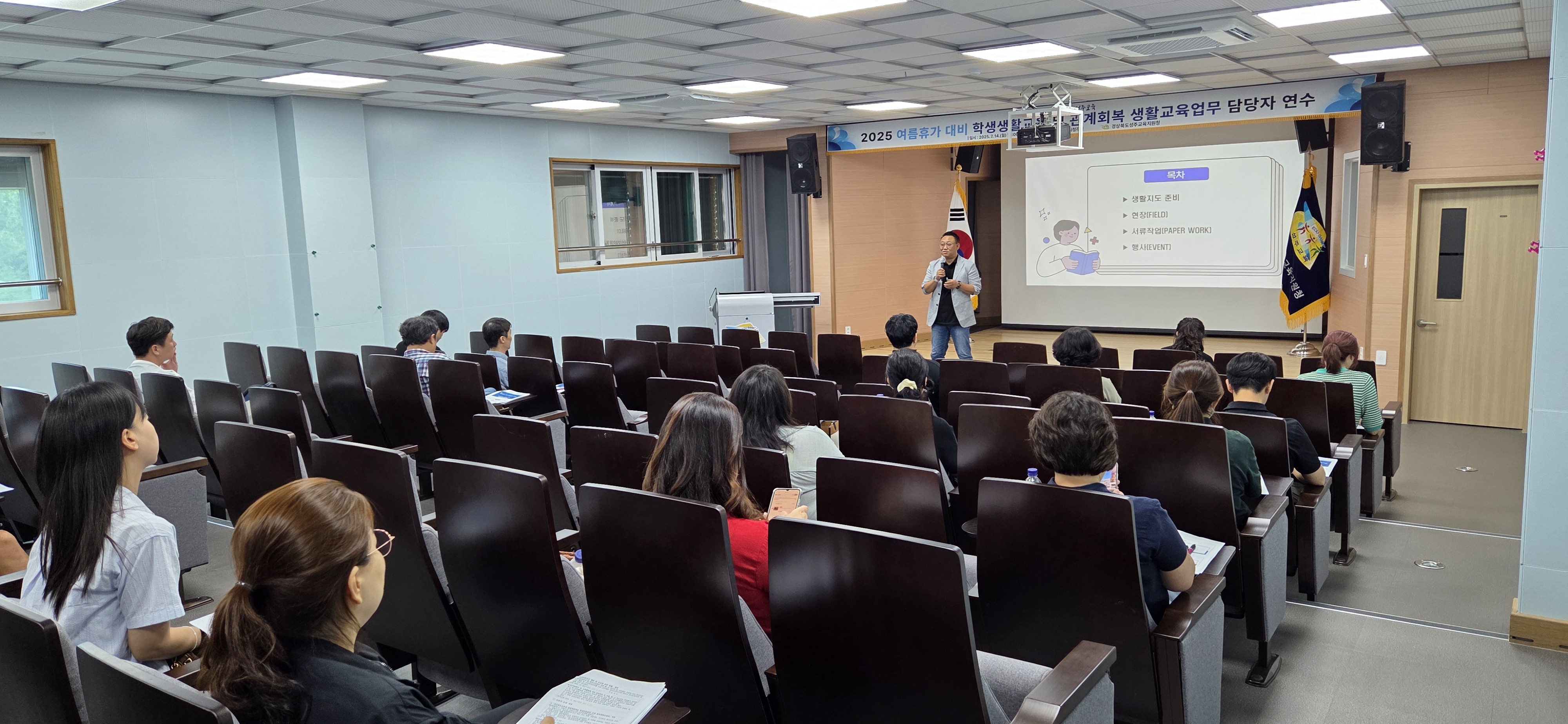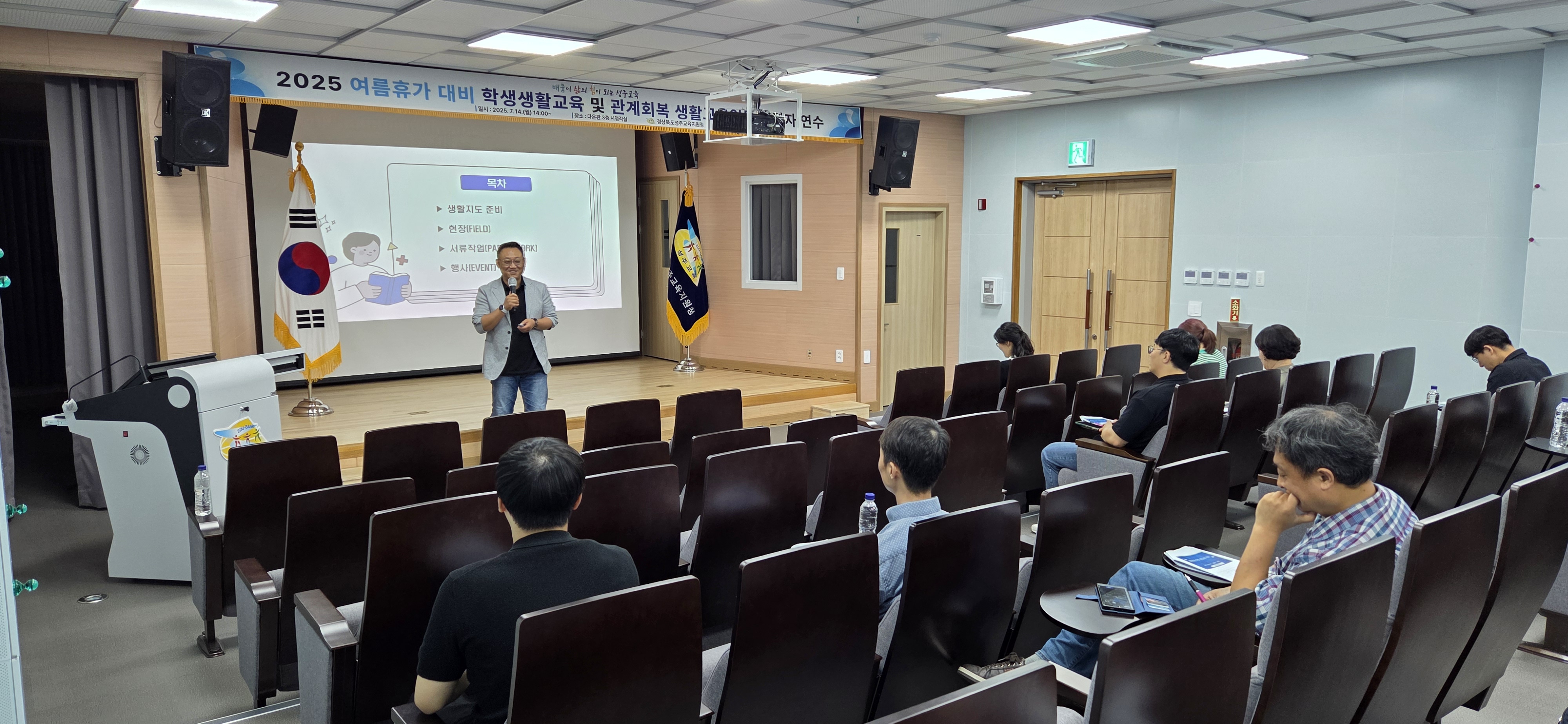□ 경상북도성주교육지원청(교육장 정수권)은 7월 14일(월) 성주교육지원청 3층 시청각실에서 초·중·고 생활지도 업무 담당교사 23명을 대상으로 여름휴가 대비 학생 생활교육 및 관계회복 생활교육 연수를 실시하였다.