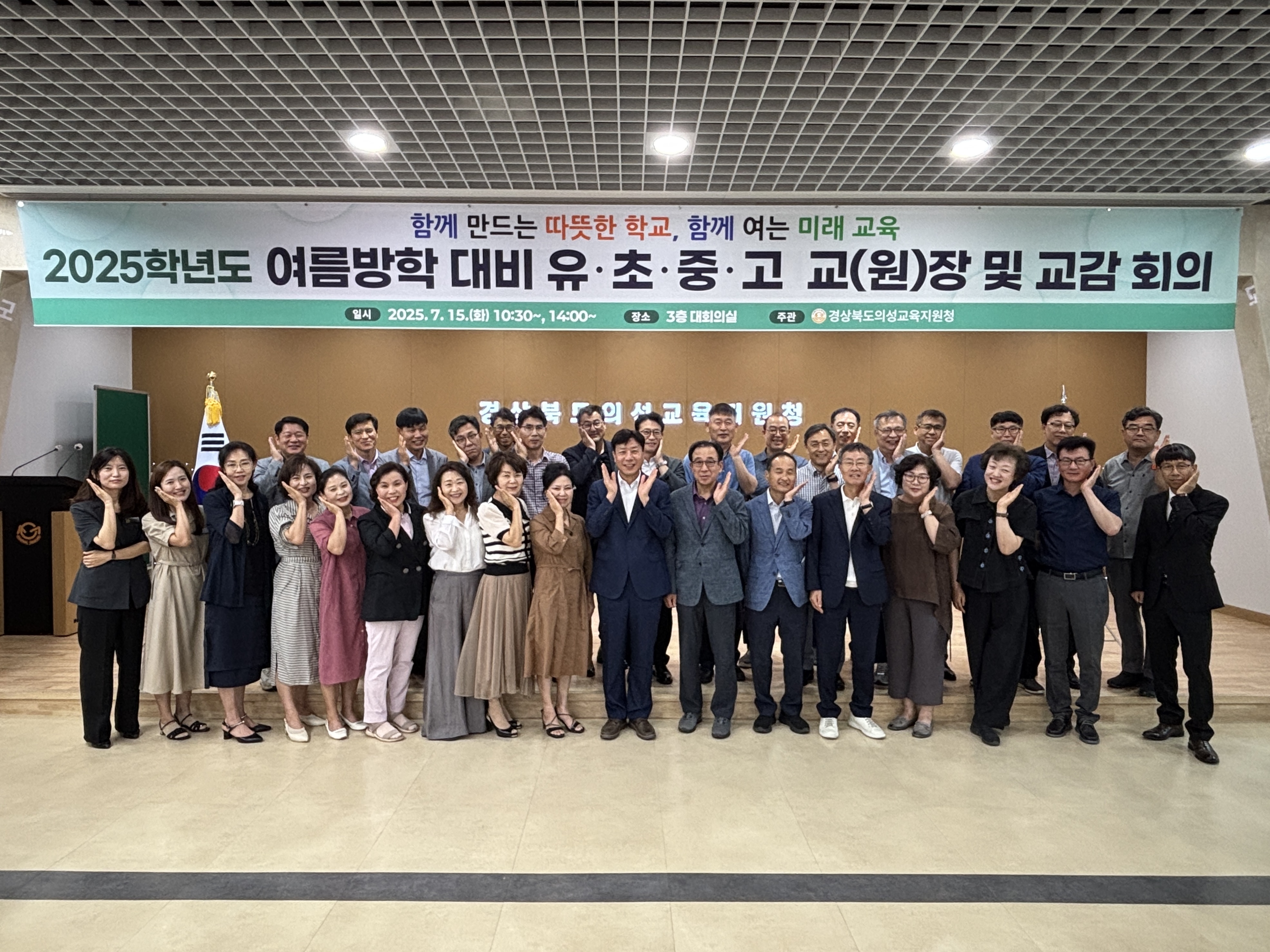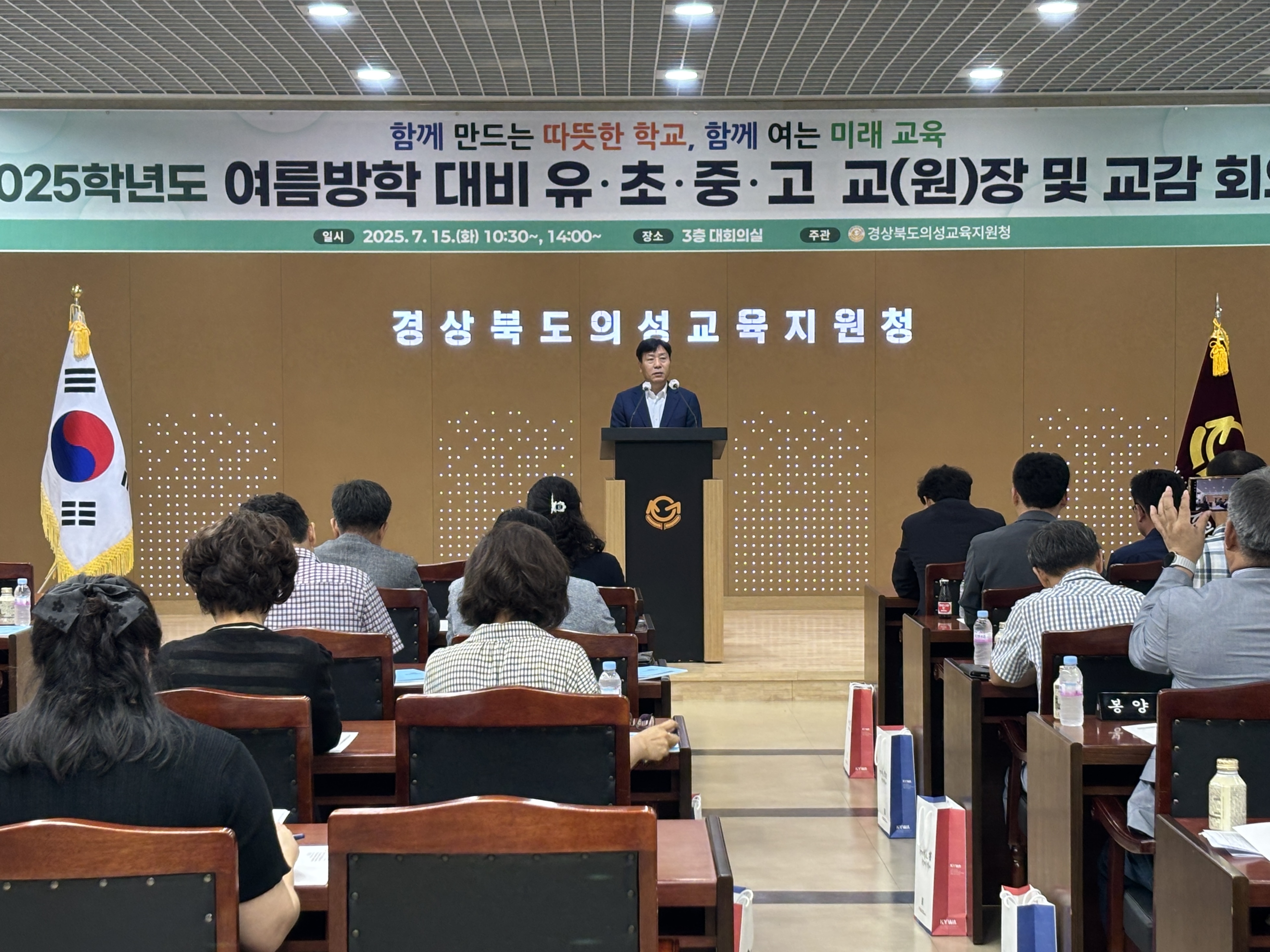 경상북도의성교육지원청(교육장 이우식)은 2025년 7월 15일(화) 의성교육지원청 3층 대회의실에서 관내 유·초·중·고 교(원)장 및 교감 40여 명이 참석한 가운데 「2025학년도 여름방학 대비 유·초·중·고 교(원)장 및 교감 회의」를 개최하였다.