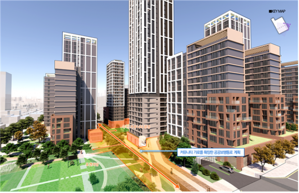 또한 보행동선과 연계한 동서방향 경관축 확보로 단지내 개방감 확보 및 지역으로 열린 도시경관을 창출한다.