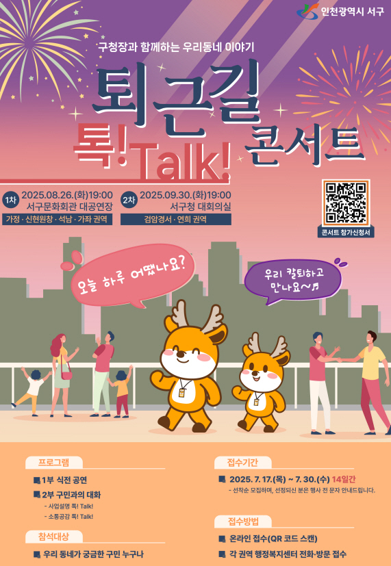 [금요저널] 인천 서구는 구청장과 함께하는 우리동네 이야기 ‘퇴근길 톡 Talk 콘서트’에 참여할 주민을 이달 30일까지 모집한다고 17일 밝혔다.