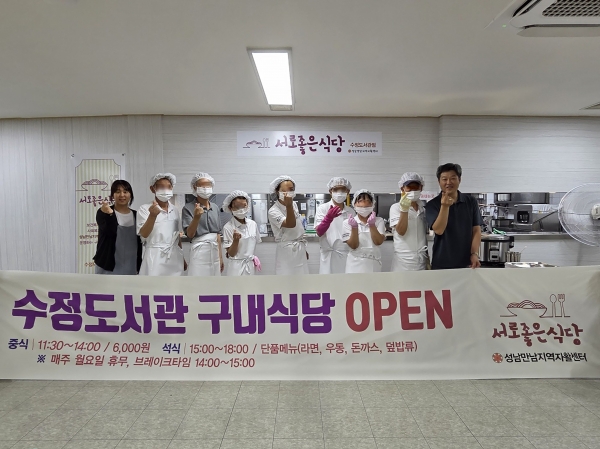 [금요저널] 성남시는 성남만남지역자활센터가 7월 1일 성남시 수정도서관 1층에 ‘서로좋은식당 수정도서관점’을 개소하고 새로운 자활근로사업단의 운영을 시작했다고 18일 밝혔다.