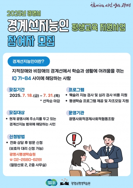 한편 광명시는 지난해 경계선지능인 평생교육 지원 프로그램 ‘함께 걷는 우리’를 운영해 2024년 경기도 평생교육 우수사례로 선정된 바 있다.