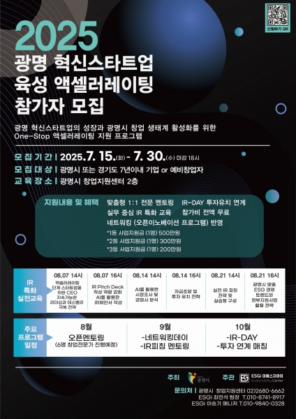박승원 광명시장은 “이번 액셀러레이팅 지원사업이 유망 스타트업의 성장 가능성을 높이고 지역 경제에 활력을 불어넣는 계기가 되길 바란다”며 “광명시가 스타트업 친화 도시로 자리매김할 수 있도록 창업 생태계 조성에 지속적으로 힘쓰겠다”고 말했다.