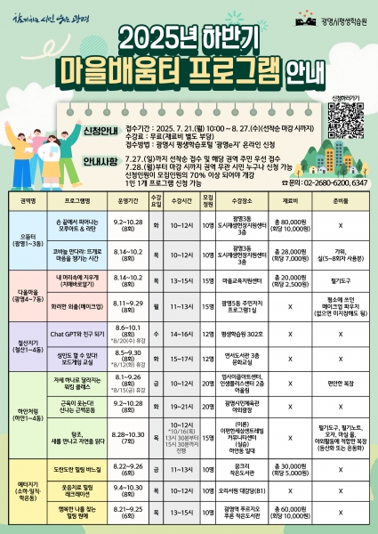 [금요저널] 광명시는 시민이 생활권 내에서 평생학습에 참여할 수 있도록 ‘2025년 하반기 권역별 마을배움터 프로그램’의 수강생을 7월 21일부터 8월 27일까지 모집한다.