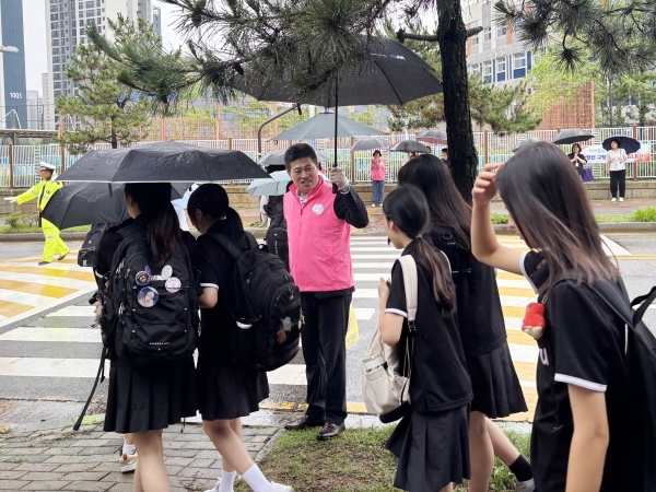 이날 김정헌 구청장은 장마철 궂은 날씨에도 학교장, 교직원, 학부모 등과 함께 학교 앞 교통환경과 현장을 면밀하게 점검하고 어린이들의 등굣길 안전을 살피는 데 주력했다.