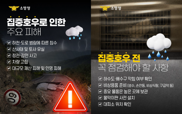 소방서는 집중호우 전 반드시 확인해야 할 주요 수칙으로 △하수도 및 배수구의 막힘 여부 점검 △생수·손전등·구급약 등 비상용품 준비 △귀중품 및 전자기기는 높은 곳에 보관 △물막이판 등 침수 방지 시설 사전 설치 △가족과 함께 대피소 위치 확인 및 비상연락체계 점검 등을 당부했다.