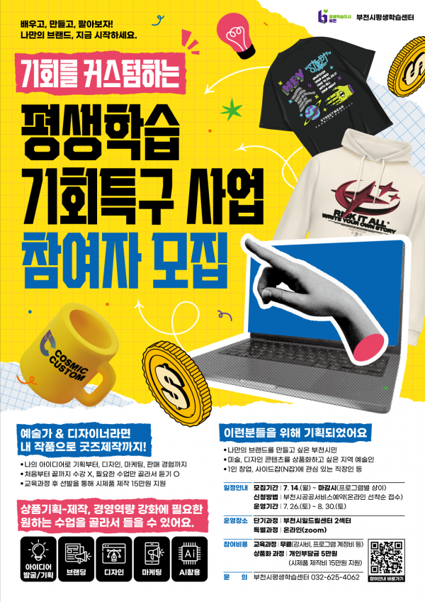 [금요저널] 부천시는 ‘2025년 경기도 평생학습 기회특구 운영 지원사업’의 하나로 추진하는 맞춤형 평생학습 프로그램 ‘기회를 커스텀하는 평생학습’ 참여자를 선착순 모집한다.
