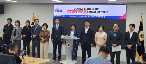 [금요저널] 성남시의회 더불어민주당협의회는 22일 성남FC 제8대 대표이사 선임 과정에서 드러난 인사 농단 의혹과 관련해 긴급 기자회견을 열었다.