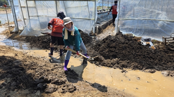 이날 이채영 의원을 비롯한 도의원들은 진흙탕이 된 논과 축사를 오가며 침수된 짚단과 토사, 사료통 등 오염물들을 정리했다.