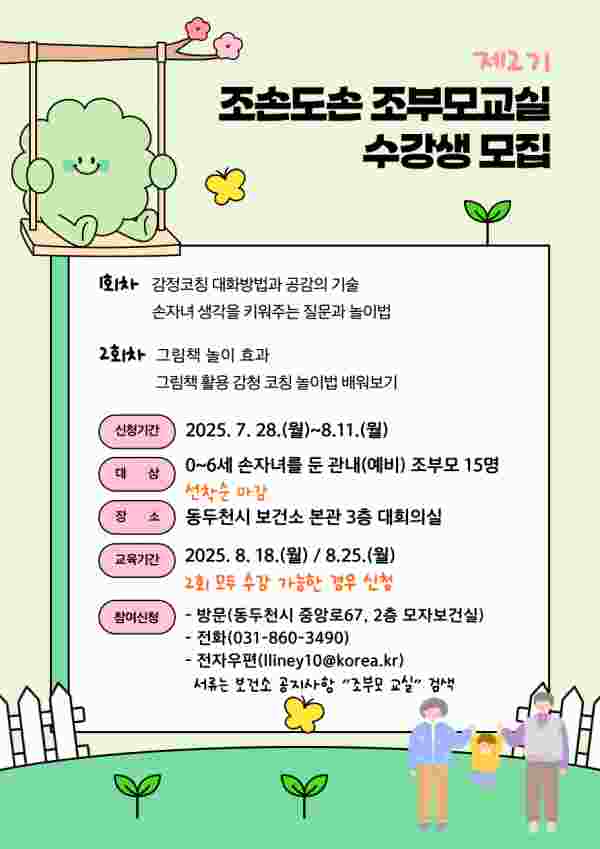 0~6세 손자녀를 둔 관내 조부모를 대상으로 방문, 전화, 전자우편을 통해 선착순으로 모집한다.