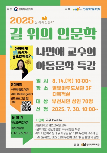 [금요저널] 부천시는 8월 14일 오전 10시, 부천시립별빛마루도서관에서 서울대학교 나민애 교수를 초청해 아동문학 특강을 연다고 밝혔다.
