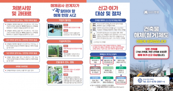 [금요저널] 안성시는 지난 2020년 5월 1일 제정·시행된 건축물관리법이 2022년 8월 4일부로 일부 개정되면서 처벌 기준이 강화됨에 따라 무단 해체를 최소화하기 위한 건축물 해체 관련 리플렛을 제작해 각 읍·면·동에 배부했다.