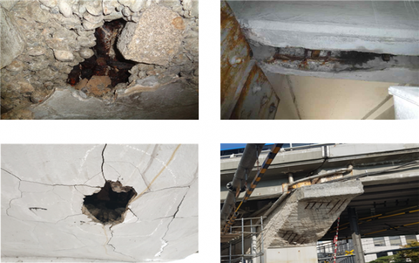 실제로 서소문고가차도는 교량 상판을 받치는 보 내·외부 강선 파손 및 전 구간 콘크리트 강도 저하 등으로 인해 ’19년 교각·슬래브 콘크리트 탈락과 철근 부식, ’ 21년 바닥판 탈락, ’ 24년 보 콘크리트 탈락과 보 강선 파손 등과 같은 손상이 반복적으로 발생해왔다.