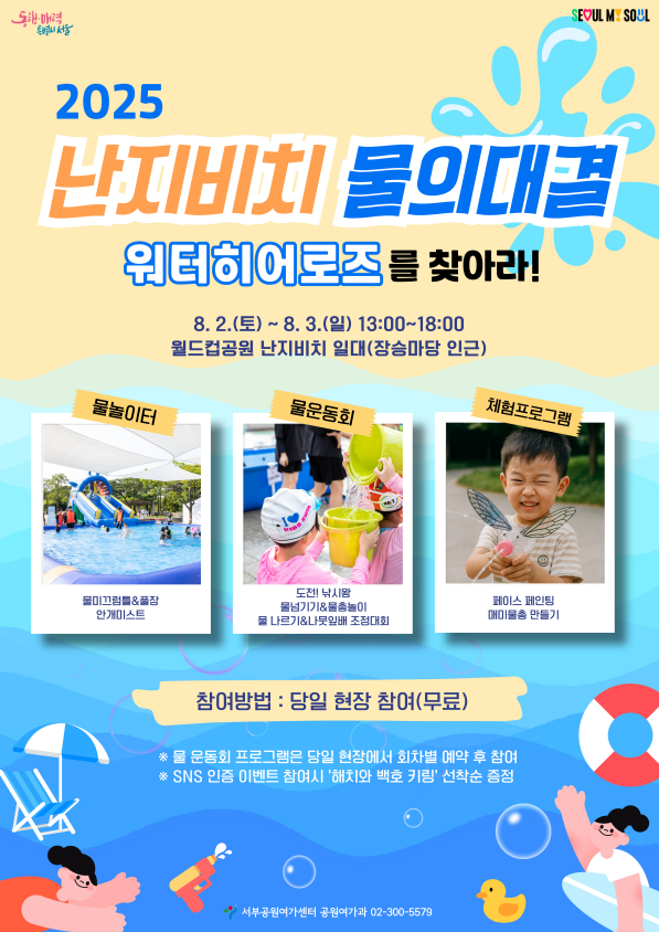 본격적인 휴가 기간인 8월 초의 무더위를 시원하게 이겨낼 수 있는 ‘2025 난지비치 물의 대결 워터히어로즈를 찾아라’는 물놀이터, 물 운동회, 체험 부스 등으로 구성된 여름 물놀이 행사로 공원을 찾는 가족들에게 시원한 여름 바캉스를 선사할 예정이다.