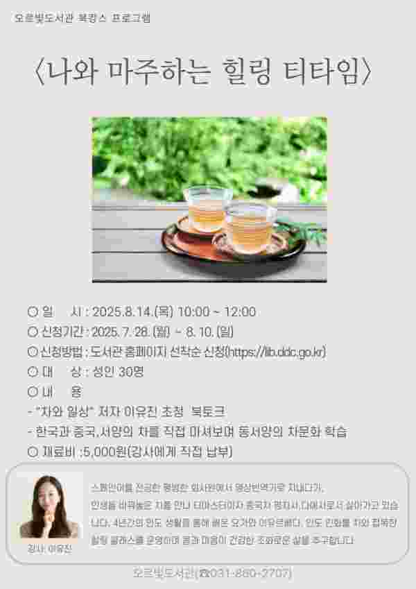 이번 프로그램은 북토크와 차 시음을 결합한 치유형 독서 문화 프로그램으로 ‘차와 일상’의 저자 이유진 작가를 초청해 운영될 예정이다.