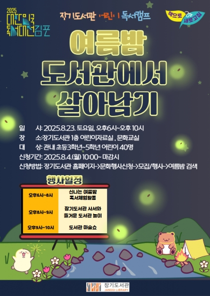 [금요저널] 김포시 장기도서관은 ‘2025년 대한민국 독서대전’ 개최를 맞아, 어린이 독서캠프 ‘여름밤 도서관에서 살아남기’를 8월 23일 오후 6시부터 10시까지 운영한다.