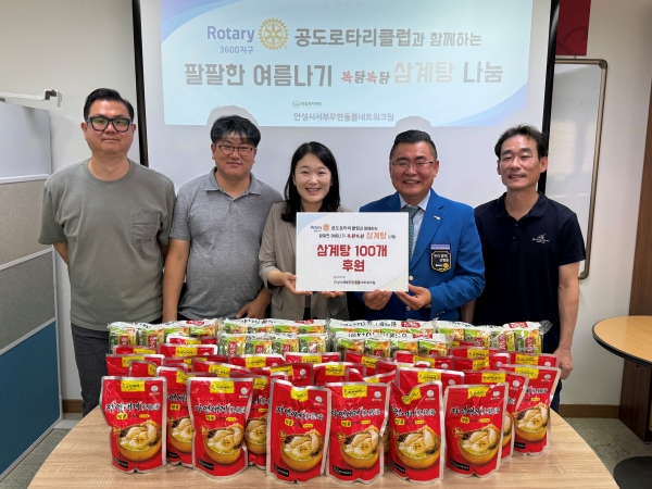 [금요저널] 사회복지법인 한길복지재단에서 수탁 운영하는 안성시서부무한돌봄네트워크팀은 국제로타리 3600지구 공도로타리클럽과 지난 29일 ‘팔팔한 여름나기 복닭복닭 삼계탕 나눔’ 전달식을 가졌다.