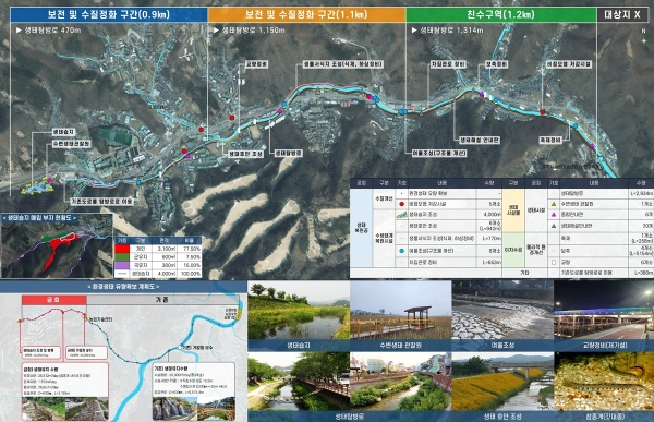 이번에 수립된 수생태계복원계획에 따르면, 농업기술센터에서 이배재터널 입구까지의 3.2㎞ 구간을 △보전·수질정화 구간 △친수구역으로 구분하고 생태 호안, 여울 조성, 생태탐방로 등을 설치해 자연과 사람이 함께하는 생태하천으로 재탄생시킬 계획이다.