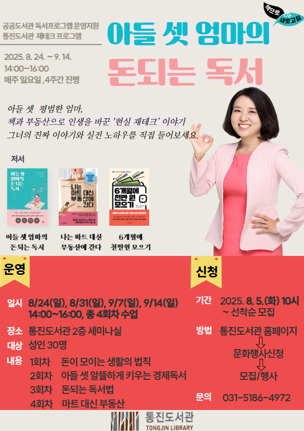 강의 내용은 △자녀 교육비 부담을 줄이는 전략 △아들 셋 알뜰하게 키우는 경제독서 △수익으로 연결되는 실전형 독서법 △무리하지 않고 투자하는 방법 등으로 구성해 복잡한 이론보다 생활 중심의 사례를 통해 누구나 공감하고 실천할 수 있는 내용로 진행된다.