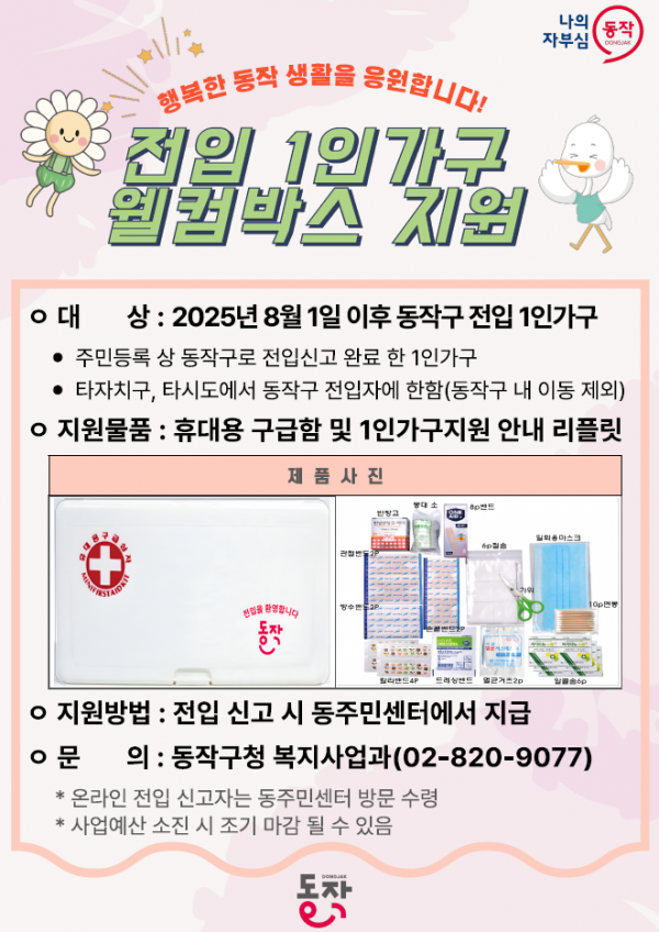 박일하 동작구청장은 “동작구로 전입한 1인 가구를 환영하는 마음을 담아 일상생활에 꼭 필요한 물품으로 웰컴박스를 준비했다”며 “1인 가구가 오래 머무를 수 있는 동작구를 만들기 위해 다양한 지원 정책을 지속적으로 마련하겠다”고 말했다.