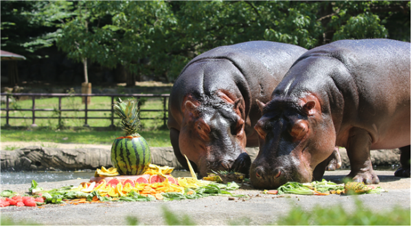 하마들에게는 여름철 활력을 북돋아 주기 위해 수박 등 다양한 과일이 제공된다.