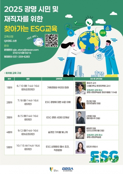 광명시 내 기업 재직자, 시민, 학생 등 ESG에 관심 있는 누구나 포스터 내 큐알코드 또는 경기기업비서 누리집으로 신청할 수 있다.