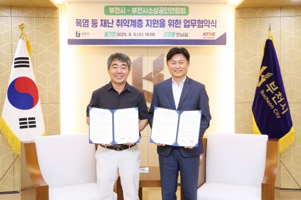 [금요저널] 부천시는 지난 6일 부천시소상공인연합회와 ‘재난취약계층 지원사업’ 업무협약을 체결하고 폭염 등 재난에 취약한 옥탑방, 반지하 거주자 및 영세 소상공인을 지원하는 민관 협력 사업을 본격 추진한다고 8일 밝혔다.