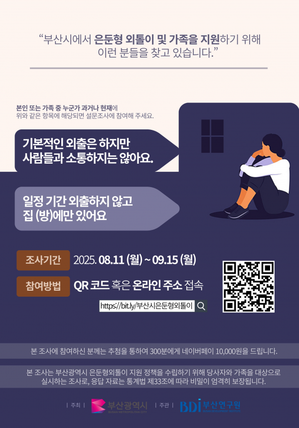 부산에 거주하는 은둔형 외톨이 당사자와 그 가족을 대상으로 한 설문조사는 오늘부터 9월 15일까지 온라인으로 진행된다.