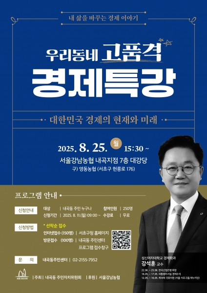 [금요저널] 서울 서초구는 오는 25일 오후 3시 30분 서울강남농협 내곡지점 7층 대강당에서 ‘내 삶을 바꾸는 경제 이야기 - 우리동네 고품격 경제특강’을 개최한다.