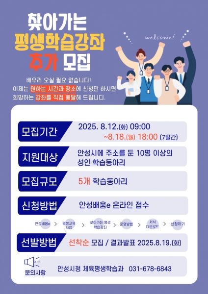 [금요저널] 안성시는 시민이 원하는 시간과 장소로 강사가 직접 찾아가는 맞춤형 평생학습 서비스인 ‘2025년 하반기 찾아가는 평생학습강좌’ 참여 학습동아리 5개를 오는 18일까지 추가 모집한다고 밝혔다.