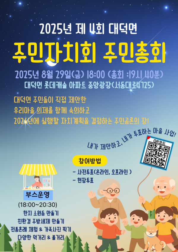 [금요저널] 대덕면 주민자치회는 오는 8월 29일 오후 6시, 롯데캐슬아파트 중앙광장에서 개최되는 ‘2025년 제4회 대덕면 주민자치회 주민총회’를 앞두고 주민 누구나 쉽게 제안 사업 투표에 참여할 수 있도록 사전투표를 활발히 진행 중이다.
