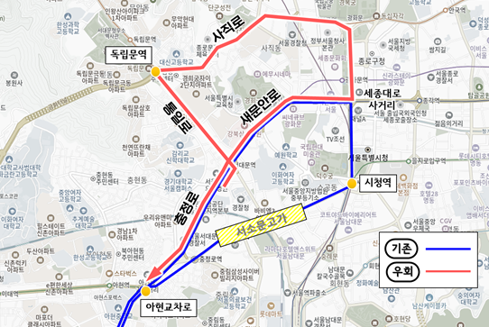 172번, 472번 등 기존에 서소문고가를 왕복으로 통과하던 5개 노선은 충정로~통일로~세종대로 등을 경유하는 경로로 우회하며 600번, 602번 등 서소문고가를 편도로 통과하던 2개 노선은 세종대로~통일로~충정로를 이용해 우회한다.