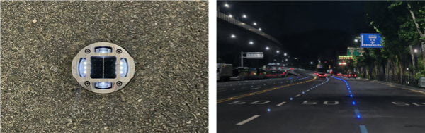 또한 주행차선에서는 앞뒤 차선 사이에 점을 찍듯이 아스팔트 위에 설치해 시인성을 한층 높였다.