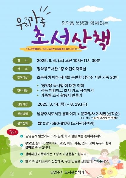 [금요저널] 남양주시는 14일부터 29일까지 정약용도서관 어린이자료실에서 열리는 ‘우리가족 초서산책’ 참가자를 모집한다고 13일 밝혔다.