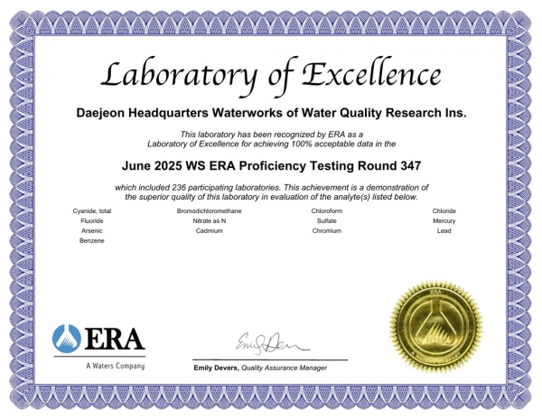 6월 9일부터 7월 24일까지 2025년 국제숙련도평가 프로그램에 참여해, 중금속, 휘발성 유기화합물, 음이온 성분 등 먹는 물 분야 13개 항목에서 모두‘적합’ 판정을 받았다.