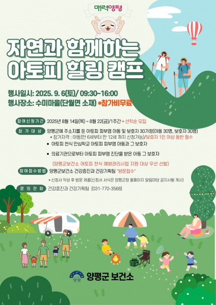 [금요저널] 양평군은 아토피피부염 환아와 그 가족을 대상으로 ‘자연과 함께하는 아토피 힐링 캠프’에 참여할 가족을 모집한다고 밝혔다.