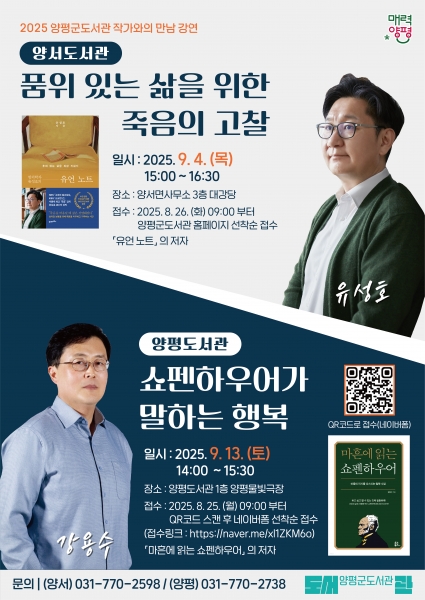 유성호 작가 강연 신청은 8월 26일 오전 9시부터 29일까지 4일간 양평군도서관 누리집에서 강용수 작가 강연 신청은 8월 25일 오전 9시부터 28일까지 4일간 네이버폼을 통해 접수한다.