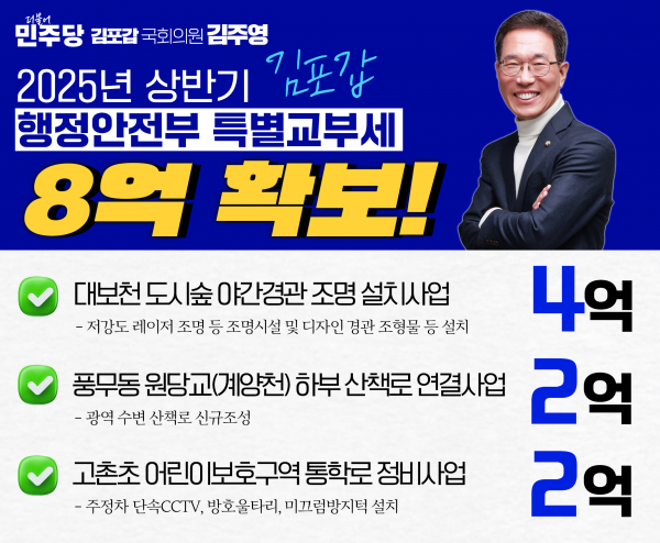 [금요저널] 국회 환경노동위원회 간사 김주영 의원이 김포시민의 삶의 질 향상을 위한 풍무동 원당교 하부 산책로 연결사업 등 2025년도 상반기 행정안전부 특별교부세 8억원을 확보했다고 14일 밝혔다.