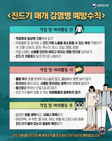 특히 소매는 단단히 여미고 바지는 양말 안으로 넣는 것이 좋으며 진드기 기피제를 보조적으로 사용하는 것도 권장된다.