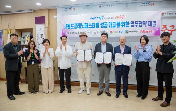 김정헌 인천 중구청장과 백현 인천관광공사 사장, 김천성 ㈜롤링홀 대표는 18일 오후 중구청 구청장실에서 이 같은 내용을 담은 ‘사운드 플래닛 페스티벌 2025의 성공적 개최를 위한 업무협약’을 체결했다.