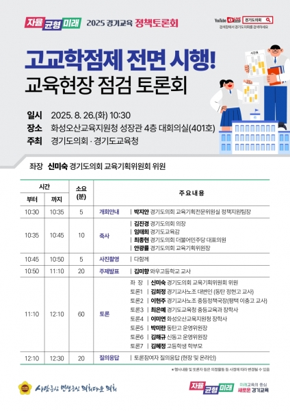 한편 토론회는 경기도의회와 경기도교육청이 공동으로 주최하며 누구나 사전 신청없이 현장 참석 또는 유튜브 생중계를 통해 참여가능하다.