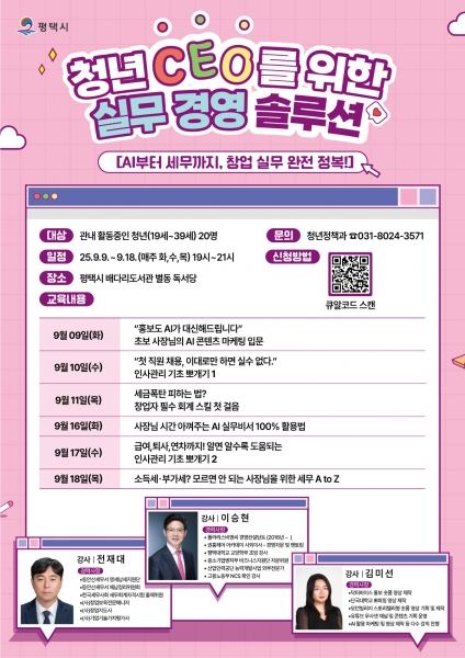 [금요저널] 평택시는 오는 9월 9일부터 18일까지 매주 화, 수, 목요일 오후 7시부터 9시까지 평택시 배다리도서관 별동 독서당에서 ‘청년 CEO를 위한 실무경영 솔루션’ 강좌를 개최하고 참여자 20명을 모집한다고 밝혔다.