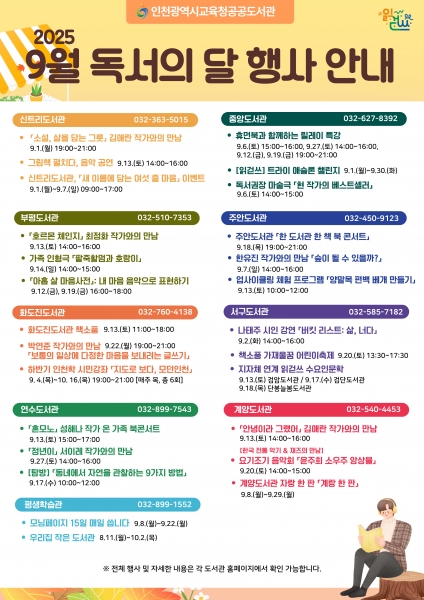 [금요저널] 인천광역시교육청은 소속 8개 공공도서관과 평생학습관에서 9월 독서의 달을 맞아 ‘읽기 예보: 오늘 읽음, 내일 맑음’을 주제로 다양한 독서 문화 행사를 운영한다고 20일 밝혔다.