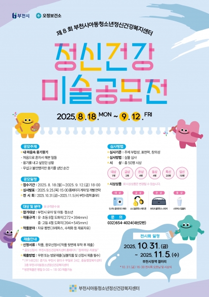 [금요저널] 부천시와 부천시아동청소년정신건강복지센터는 아동청소년 정신건강에 대한 공감대 확산과 인식 개선을 위해 9월 12일오후 6시까지 ‘제8회 정신건강 미술공모전’을 연다.